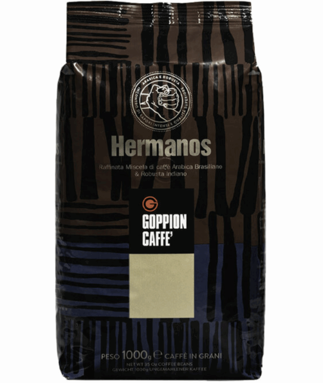 Questo caffè in chicchi Hermanos di Goppion Caffe è la vera interpretazione di un espresso dal gusto pieno. Viene prodotto utilizzando dei chicchi 50% arabica brasiliano (Cerrado) e 50% robusta indiano (robusta Cherry AA). In tazza, un caffè persistente e intenso, vellutato e aromatico, con una nota speziata.